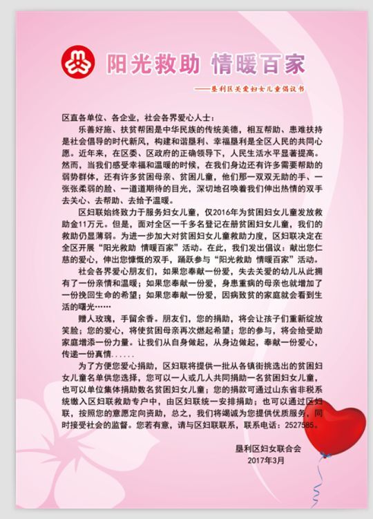 阳光救助 情暖百家——垦利区关爱妇女儿童倡议书